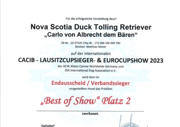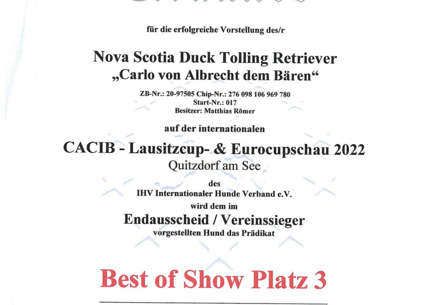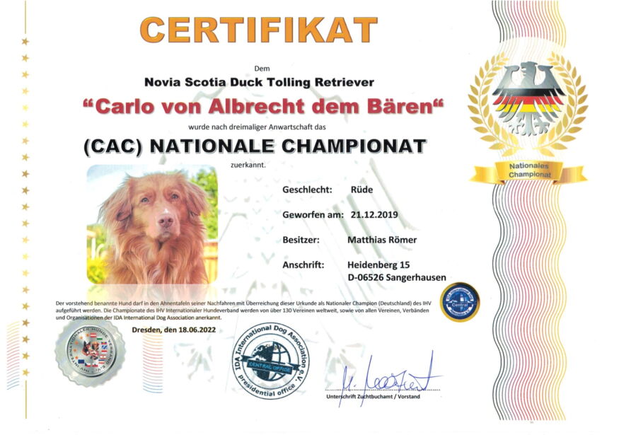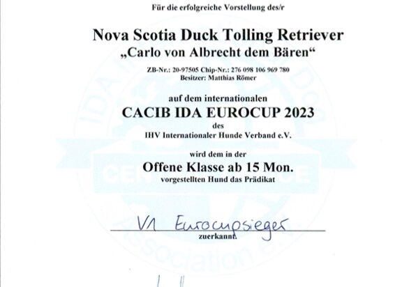 Carlo hat am 19.6.2022 die Zuchtzulassung des IHV e.V. und im Juli 2024 des IRJGV e.V. erhalten.